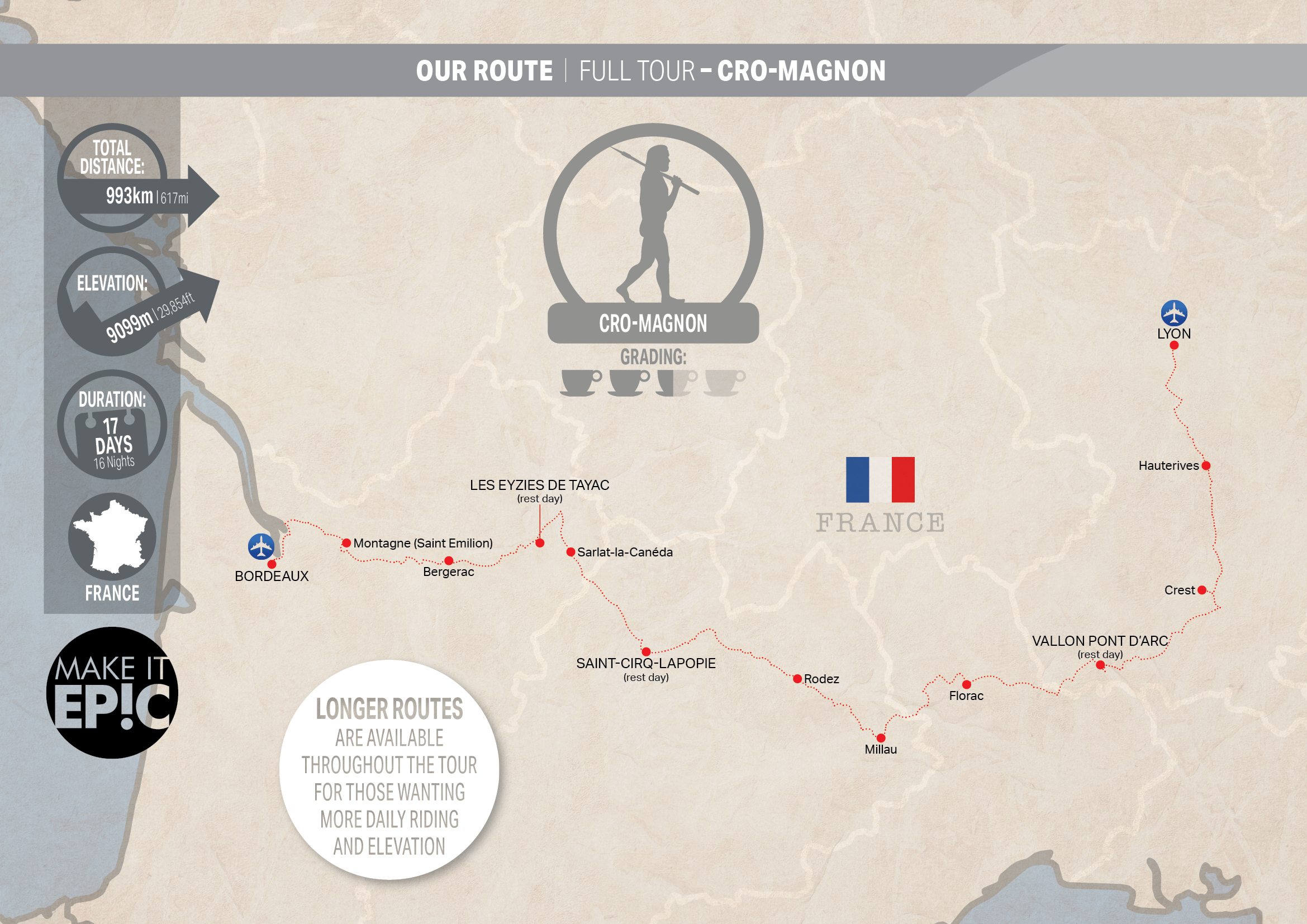 From the culinary capital of Lyon to the wine mecca of Bordeaux this tour meshes remarkable pre-historic sites with a gastronomic odyssey across southern France. This is our only single country Epic but is also defined by a remarkable diversity of cuisine, landscapes, and history along the route.