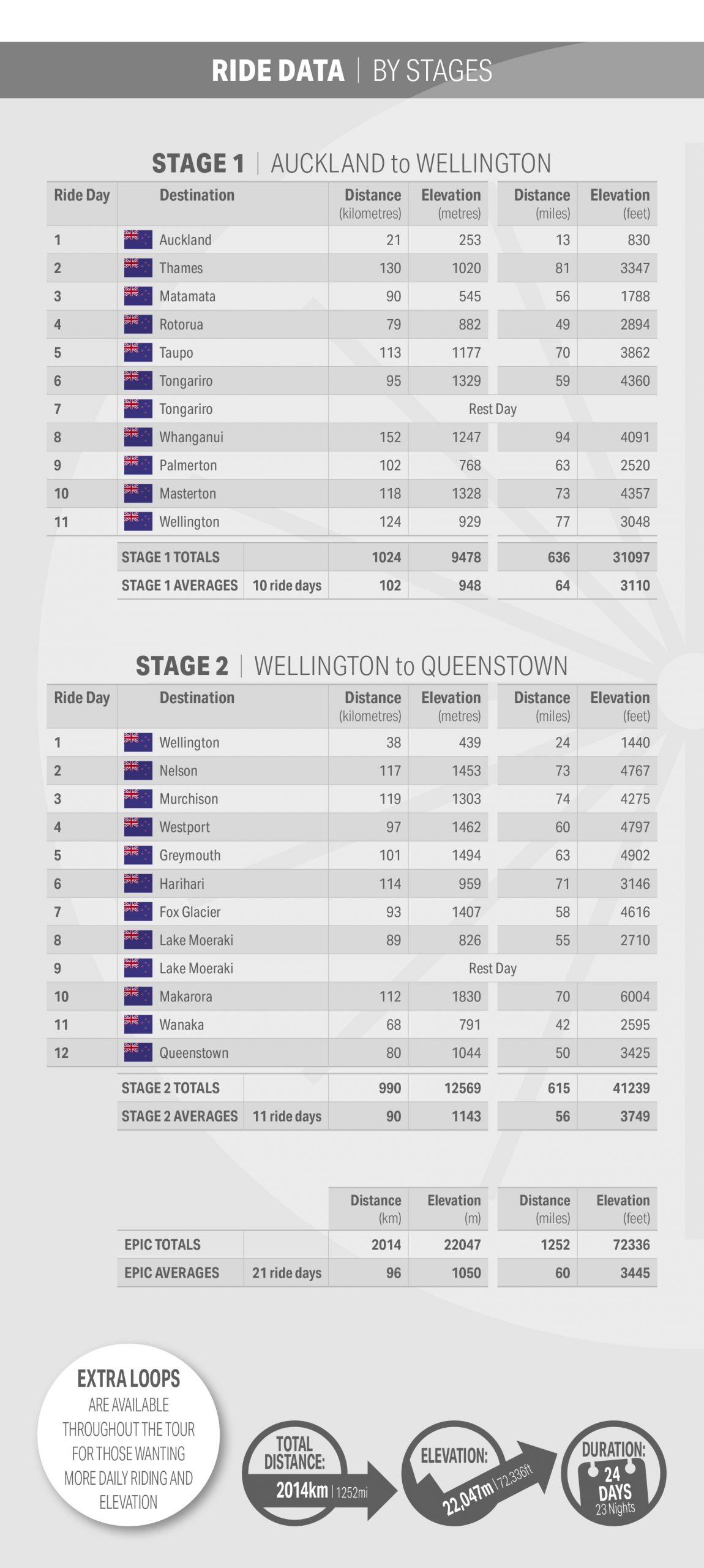 | Stage 1 – Auckland to Wellington | 3rd Feb | 14th Feb | 12 (11 nights) | 1025 km / 636 miles | € 5,150 |