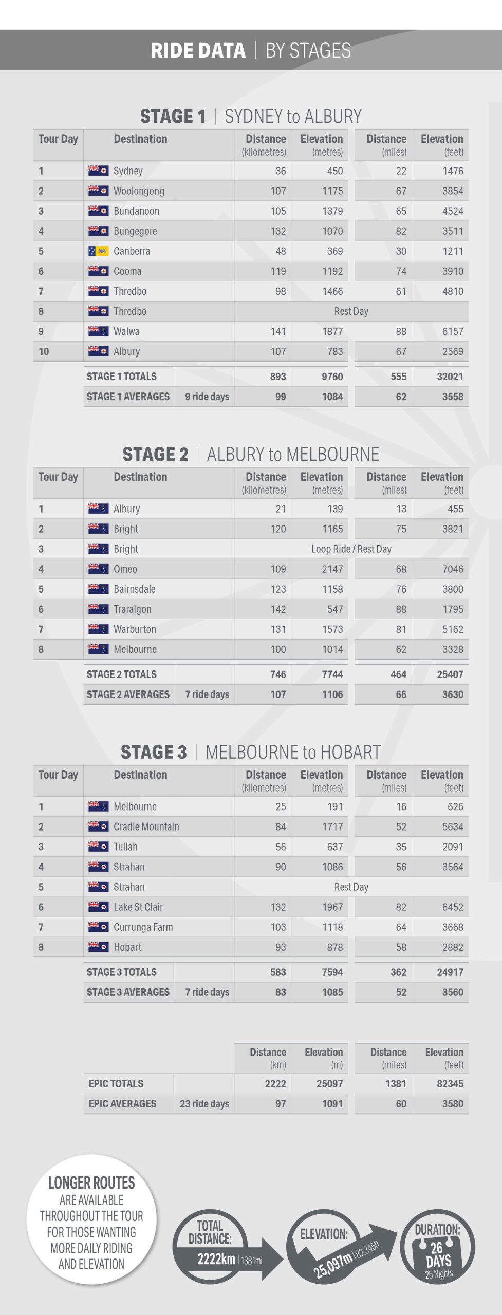 Strzelecki is split into three stages. Stage 1 begins and ends in New South Wales. Stage 2 begins on the border with NSW and continues through Victoria. Stage 3 begins in Melbourne and travels through Tasmania after a ferry journey from the mainland